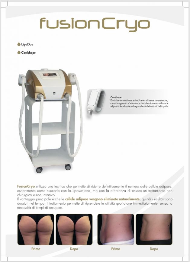 è l’alternativa non chirurgica alla liposuzione, non invasiva e senza rischi. Elimina il grasso localizzato attraverso l’uso del freddo, in sintesi le cellule adipose colpite dal freddo collassano, muoiono e quindi si riducono . Con un trattamento di 1 ora, si elimina circa il 22% del grasso, il trattamento è assolutamente indolore.